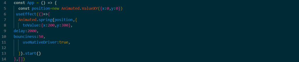 First, the code specifies the App component. Animated.ValueXY is introduced in the codebase for setting the initial value of x and y as 0. This means that the Animation will start from 0,0. It will go till x: 200 and y:200. It is delayed by 2 seconds. The bounciness property of the animation is 50 and it uses the Native driver.