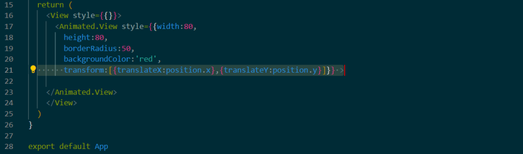 If not ValueXY, we could have used the standard form of a value class, i.e., the Animated.Value. However, for the current project, we will consider the 2D animated view. The ‘X’ and ‘Y’ linked to the Animated.Value is to mention the value of X and Y. thus you can be specific about its initial state and the ending state, which may not be possible to attain with Animated.Value.
